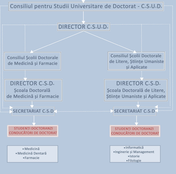 IOSUD of UMPhST G.E. Palade Tg. Mureș In the University structure there is the Institution Organizing University Doctoral Studies I.O.S.U.D. that is composed of the affiliated Doctoral Schools. George Emil Palade University of Medicine, Pharmacy, Science and Technology of Târgu Mureş has two Doctoral Schools: - The Doctoral School of Medicine and Pharmacy with three main domains - Medicine, Dentistry, and Pharmacy. - The Doctoral School of Letters, Humanities and Applied Sciences with four main domains - Philology, History, Computer Science, Engineering and management. The Institution Organizing University Doctoral Studies I.O.S.U.D. has the Doctoral University Studies Council as a collective governing body.