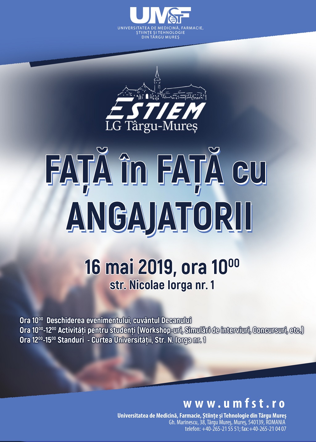 Începând cu anul universitar 2019-2020 informatiile privind stagiile de practica si ofertele de angajare ale companiilor, precum și evenimentele organizate in parteneriat cu acestea sunt disponibile pe platforma https://u2b.umfst.ro, astfel: